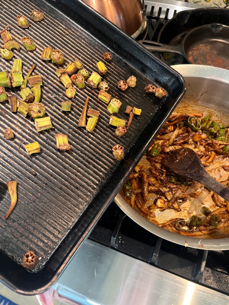 Preheat the oven to about 400 degrees while you prep the vegetables. When it’s at the correct temperature, add the rounds of okra to a baking sheet well spaced and roast dry for about 10 minutes or until browned, then toss to brown on all sides. This enhances the flavor and reduces the slime.