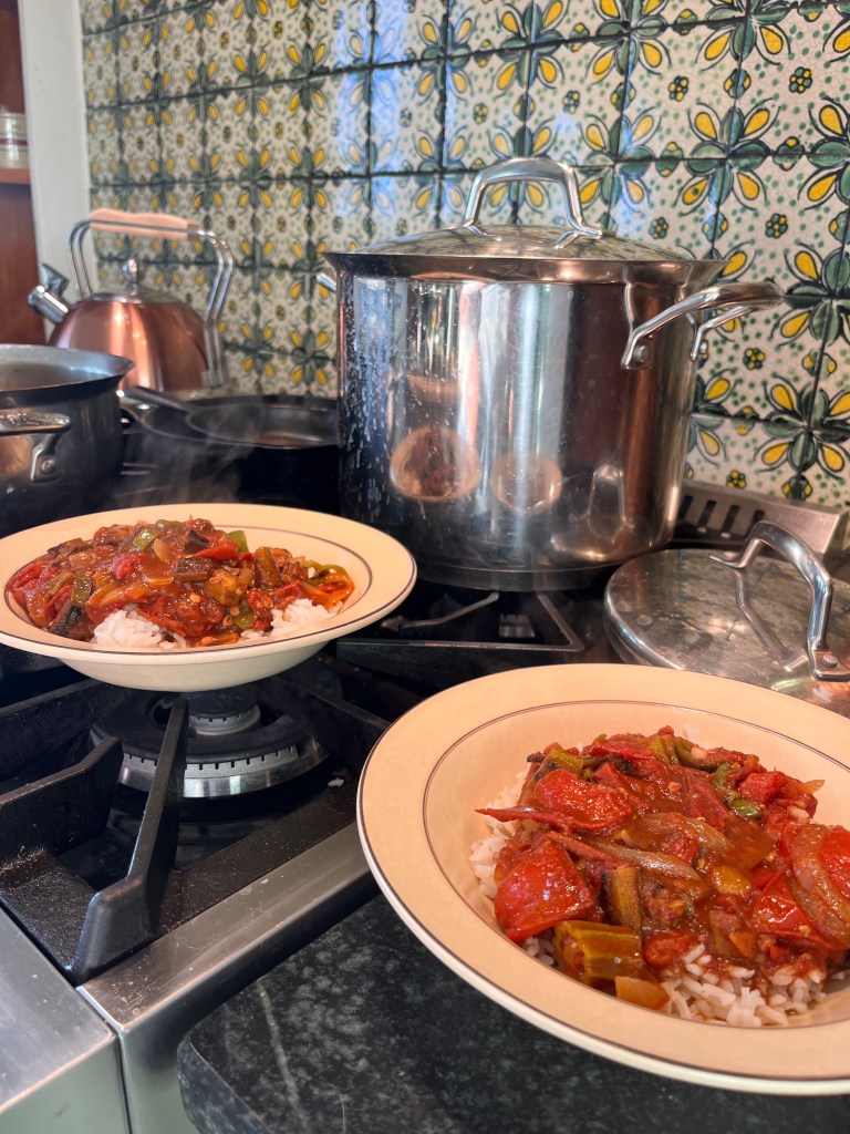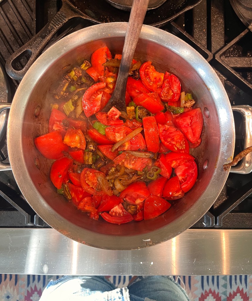 In a medium size soup pan, add about a Tablespoon of butter and a long pull of olive oil (coconut oil would work well here too) to a preheated pan. When the oil/butter is running quickly but not burnt, add the onions and peppers. Cook until just translucent and then add the spices and garlic. I always estimate my spices based on feel and experience but for this recipe I’d estimate I use approximately a Tablespoon or a little less of each of the following: curry powder, cumin, smoked paprika. Then about a half tablespoon of garam masala, and about a half tsp of allspice. I’m not shy with my spices but it’s important to know the flavor of each and adjust to your taste. Allow to cook together to become very fragrant and begin sticking to the pan. Then, add all of your tomatoes. These will deglaze your pan and begin to simmer quickly. If you find your curry is too dry, add a splash of broth or water. Add your roasted okra to the mix and allow to gently simmer to incorporate. As it cooks down, salt to taste. You know you’ve got the right amount of salt when you taste buds give you a *zing*.