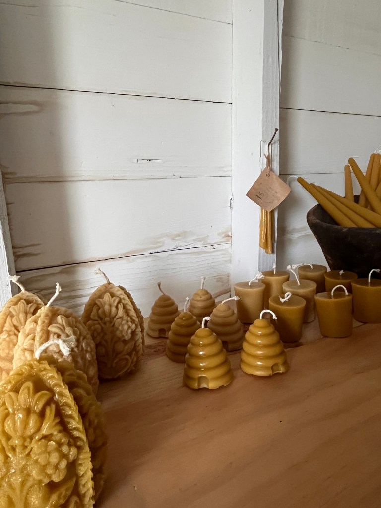 - 100% Beeswax Candles: Carved eggs, honeybee hives votives, classic votives, 10″ tapers