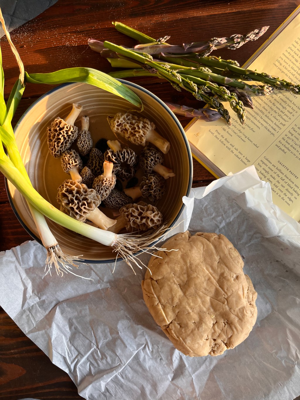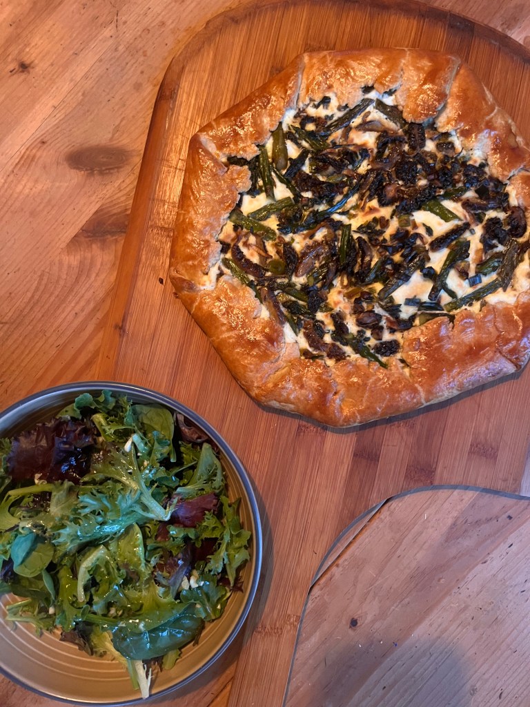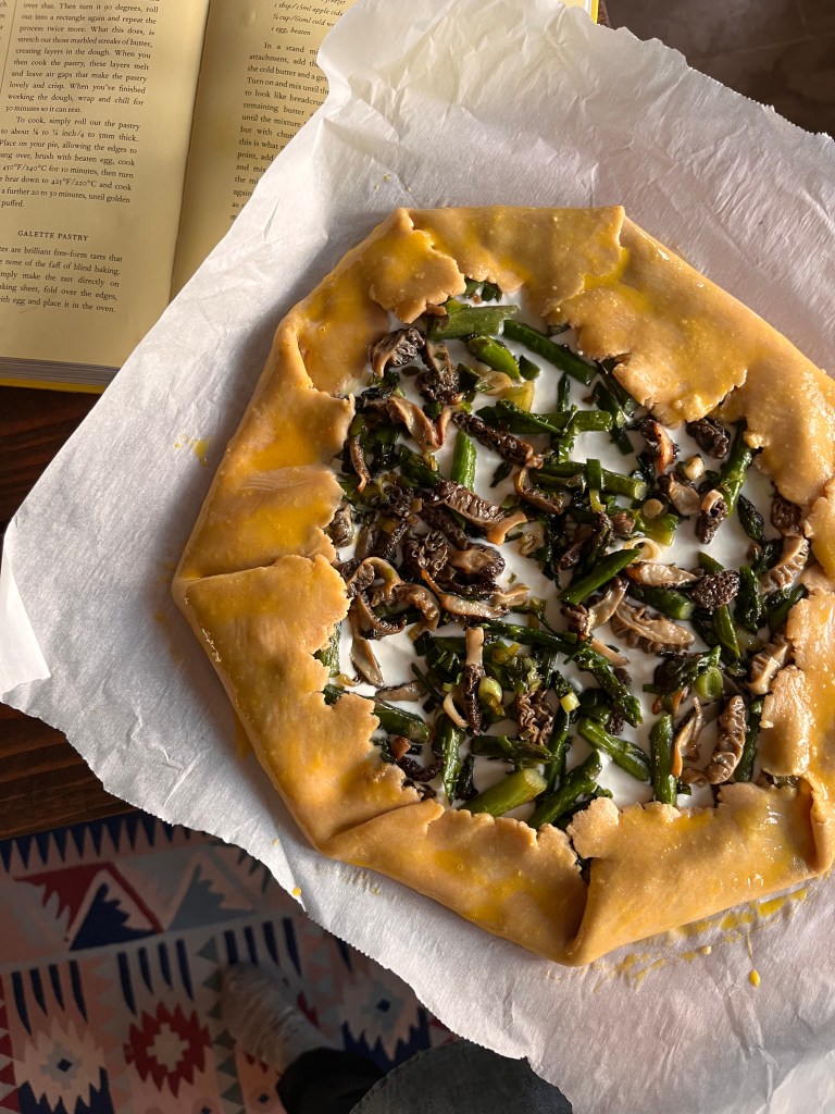 The absolute king of rustic sophistication, a simple galette is the perfect palette for the early foraged and garden flavors. For this dinner, we savored the handful of early morels from our Easter day mushroom hunt, added a couple garden delights with spring garlic, and asparagus, and baked them on lemony whipped ricotta with a perfectly flaky pastry crust. Heaven!. We served this dinner with a simple green salad and a quick homemade dressing. A stunner for guests or a treat for yourself on a weekday.